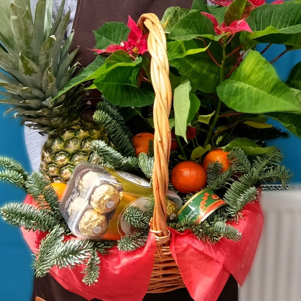 Подарочная корзина, полезный подарок к новогоднему столу. Спелый Ананас, вкусная красная икра, конфеты, мандарины и конечно же живая ель и Пуансетия.