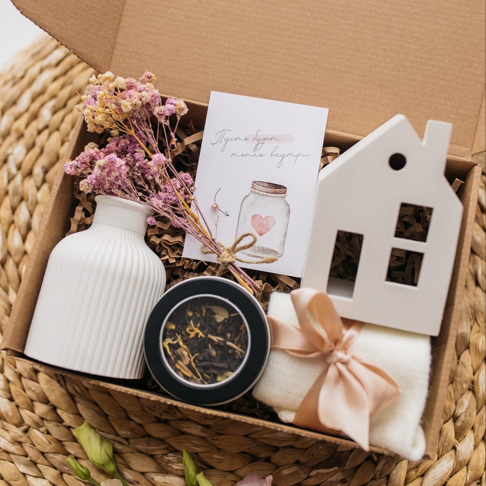 Что внутри? носочки шерстяные гипсовый подсвечник домик гипсовая вазочка букетик сухоцвет из гипсофилы чай "Таежный сбор" 30 гр открытка Элегантный набор в духе северного минимализма, где каждый предмет создает особую атмосферу комфорта. Набор оформлен в крафтовой коробочке 24*18 с атласной лентой. Подарочный пакет в комплекте!