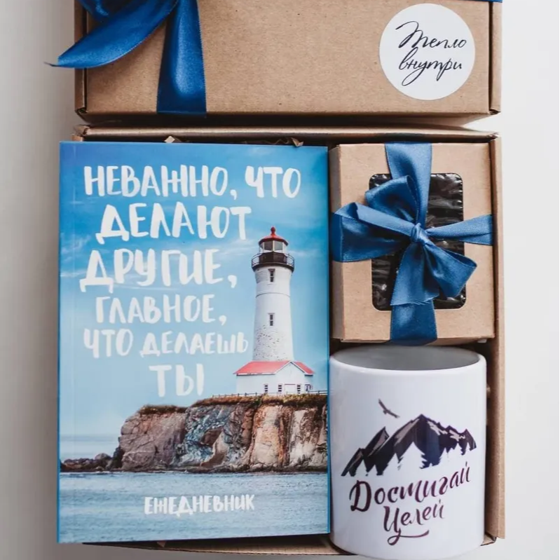 Мотивирующий и яркий подарочный мужской набор. Это будет незабываемый и оригинальный презент к любому празднику. Блокнот для самых важных записей, керамическая кружка, ассорти орехов в темном шокол...