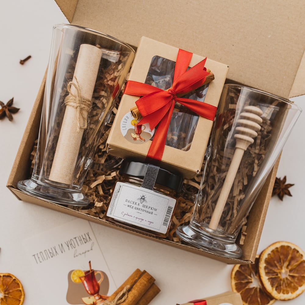 Что входит? - Бокал для глинтвейна (2 шт.) - Специи для глинтвейна - Мёд цветочный - Рецепт - Ложка-веретено для меда - Пряник ручной работы - Открытка Набор оформлен в крафтовой коробочке 23*18 с атласной лентой. Подарочный пакет в комплекте!