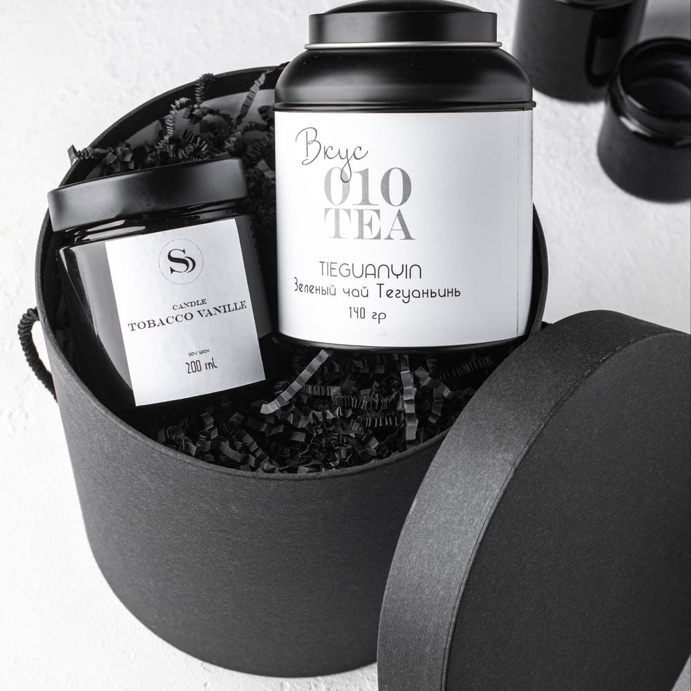 Стильный подарок состоящий из элитного чая Тегуанинь и ароматической свечи в баночке с ароматом Tobacco Vanille в круглой коробке Качественный и стильный подарок, который подойдёт для всех. Пода...