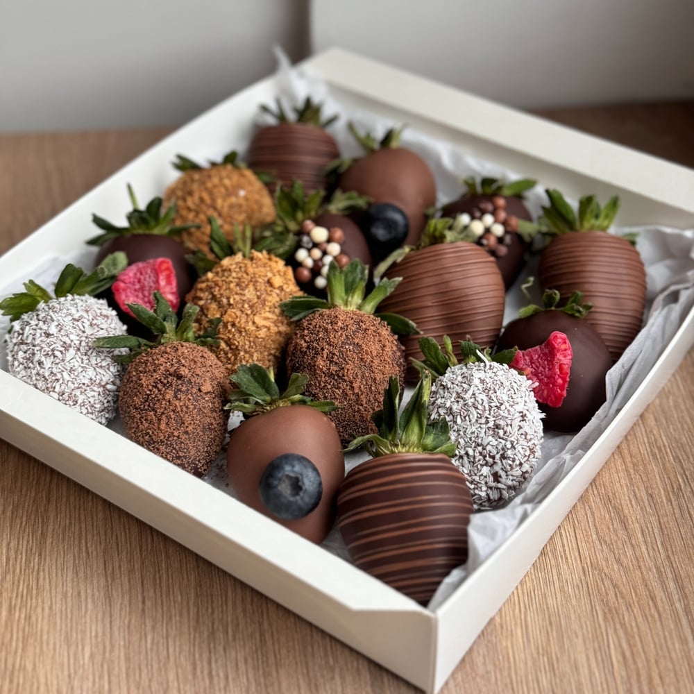 Клубника в молочном и темном шоколаде. Украшены свежей малиной и голубикой, кокосовой стружкой, вафельной крошкой, шоколадным печеньем, шариками кранч