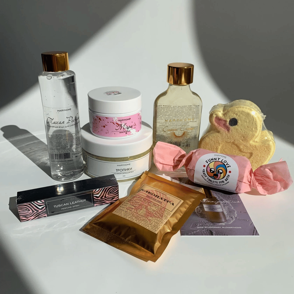 Описание набора: 1. Мицеллярная вода,150мл; 2. Кокосовое масло, 100мл; 3. Маска для лица "Клеопатра", 40г; 4. Бомбочка для ванны с пеной “Уточка”, 200г; 5. Скраб для тела, 350г; 6.Масло Ши, 100…