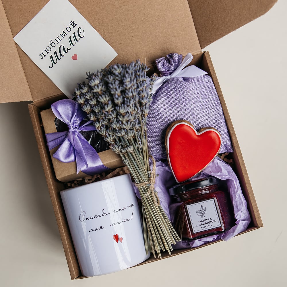 Что внутри? - Чай черный "Таёжный сбор" в мешочке - Кружка керамическая - Букет лаванды - Виноградные конфеты - Мармелад в баночке малина-лаванда - Пряник ручной работы - Открытка Замечательный набор для мамы и бабушки на День рождения, 8 марта, юбилей, День Матери или просто так! В наборе милая кружка, ароматный чай "Таёжный сбор", виноградные конфеты, пряник, мармелад в баночке и душистый букет лаванды. Отличный подарок для любимых