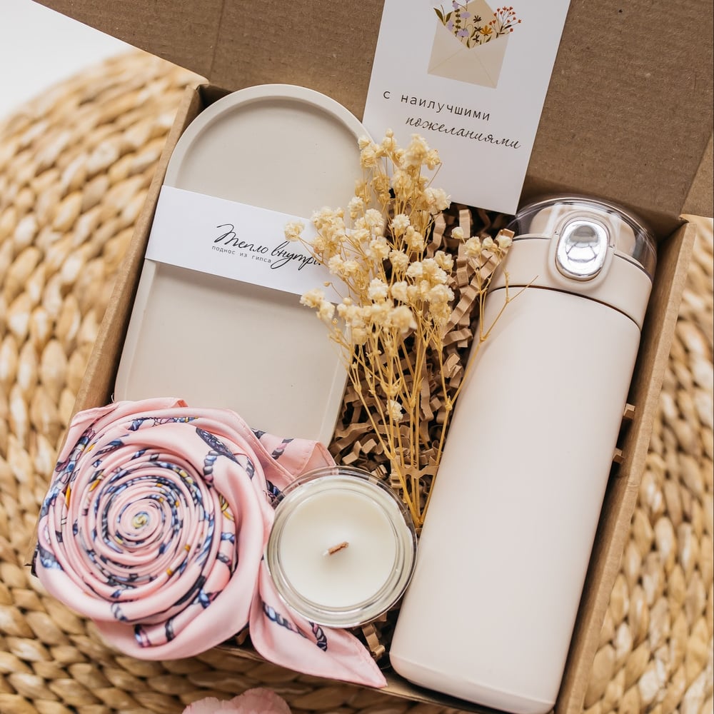 Что внутри? термос бежевый 400 мл гипсовый поднос для ваших украшений уютный шейный платок свечка хлопковая с эффектом потрескивания во время горения букетик сухоцветов из гипсофилы открытка Лаконичная композиция в благородных тонах для тех, кто ценит простоту и элегантность. Набор оформлен в крафтовой коробочке 20*20 с атласной лентой. Подарочный пакет в комплекте!