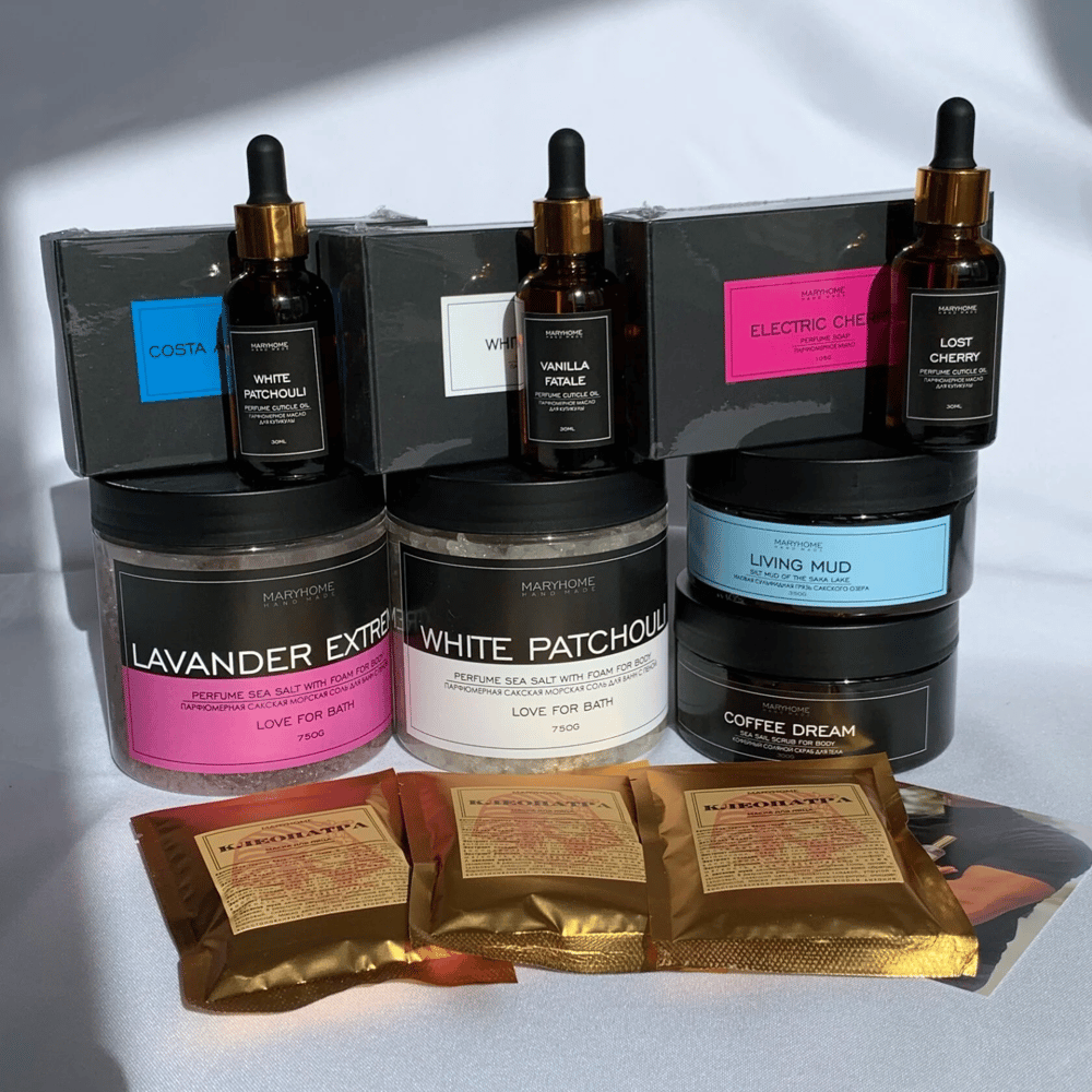 Описание набора: 1. Соль для ванны с пеной, 750г - 2шт; 2. Мыло, 105г – 3шт; 3. Маска для лица "Клеопатра", 40г - 3шт; 4. Скраб для тела "Кофейный Бриз”, 300г; 5. Иловая сульфидная грязь Сакског…