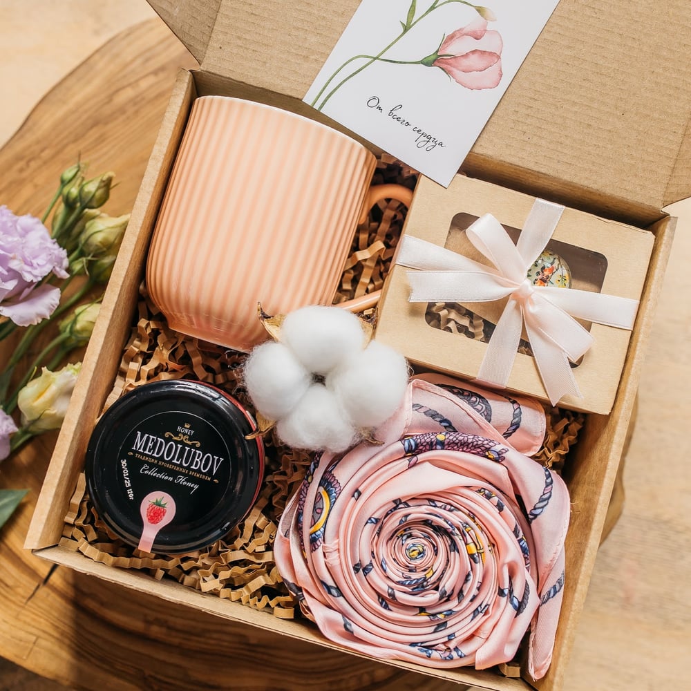 Что внутри? - шейный платок - керамическая кружка - мед-суфле ягодный - брошь "Красные птицы" - кокосовая конфета - открытка для ваших пожеланий Набор оформлен в крафтовой коробочке 20*20 с атласной лентой. Подарочный пакет в комплекте!