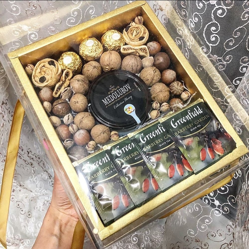 Подарочный набор орехов с медом, чаем и сладостями.