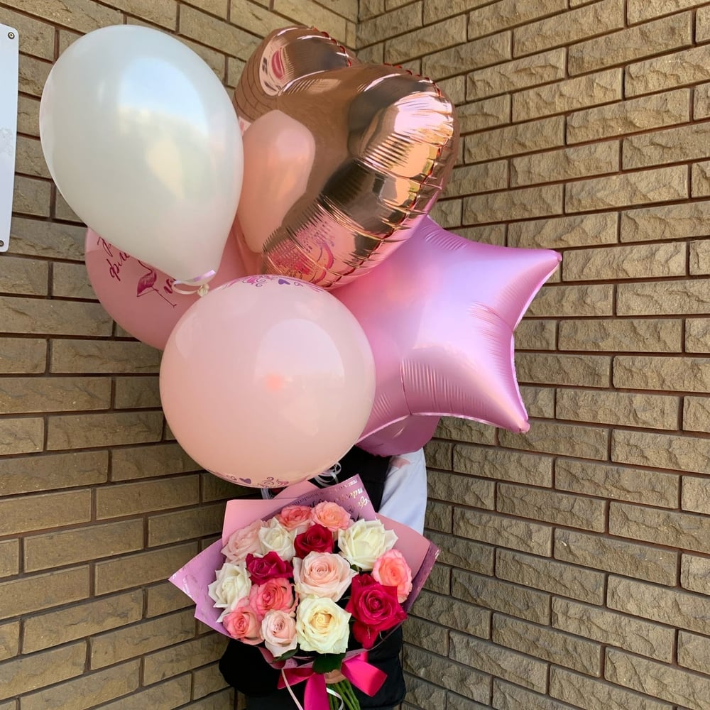 Букет роз + набор гелиевых шаров.