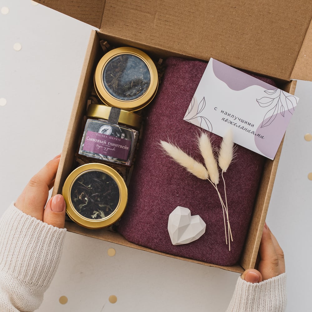 Что внутри? - Шарф-палантин женский, 180*70; - два вида чая в баночках; - варенье "Сливовый глинтвейн", 120 гр; - декор из сухоцветов; - гипсовое саше; - открытка; - пакет.