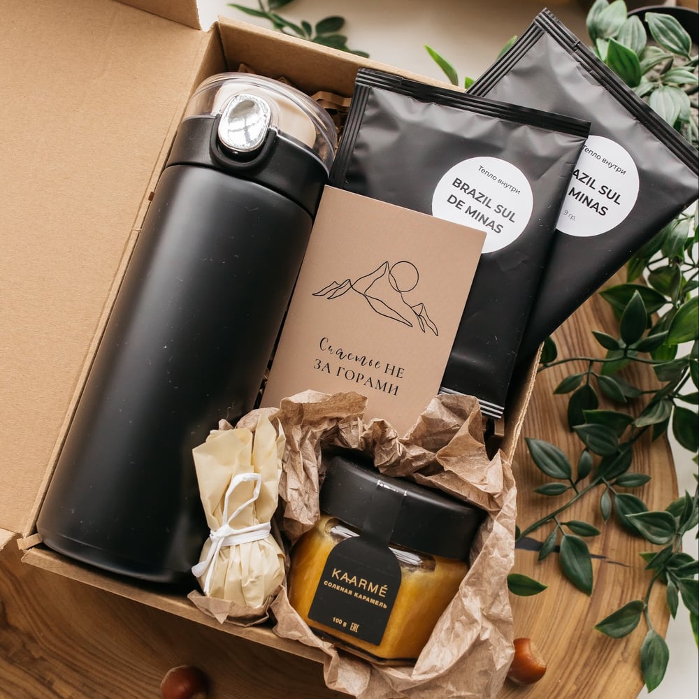 Что внутри? термос 400 мл дрип кофе (2 уп.) кокосовая конфета соленая карамель 100гр открытка Подарочный набор вдоховляющий начинать каждое утро с ароматного кофе и нежной соленой карамели. Набор оформлен в крафтовой коробочке 24*18 с атласной лентой. Подарочный пакет в комплекте!