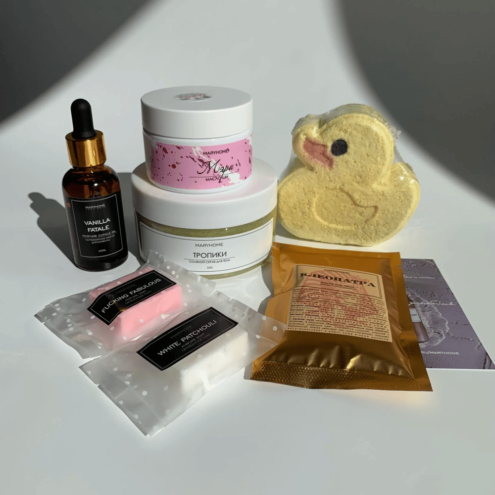 Описание набора: 1. Маска для лица "Клеопатра", 40г; 2. Бомбочка для ванны с пеной “Уточка”, 200г; 3. Скраб для тела, 350г; 4.Масло Ши, 100г. 5. Мыло, 17г – 2шт; 6. Масло для кутикулы, 30мл; 7…