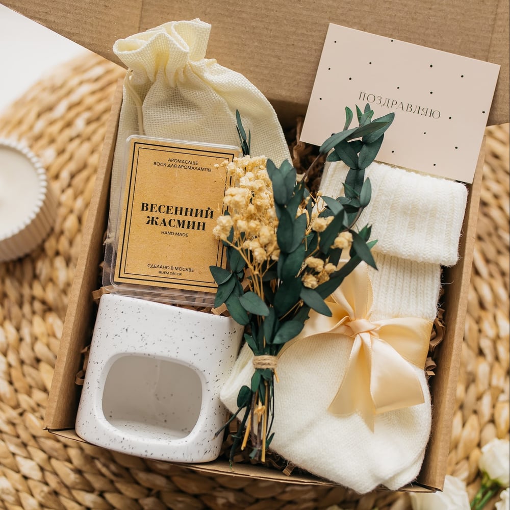 Что внутри? носочки шерстяные аромалампа саше восковое с ароматом жасмина букет сухоцветов из гипсофилы и эвкалипта открытка Изысканная композиция, словно первые лучи весеннего солнца в сад...
