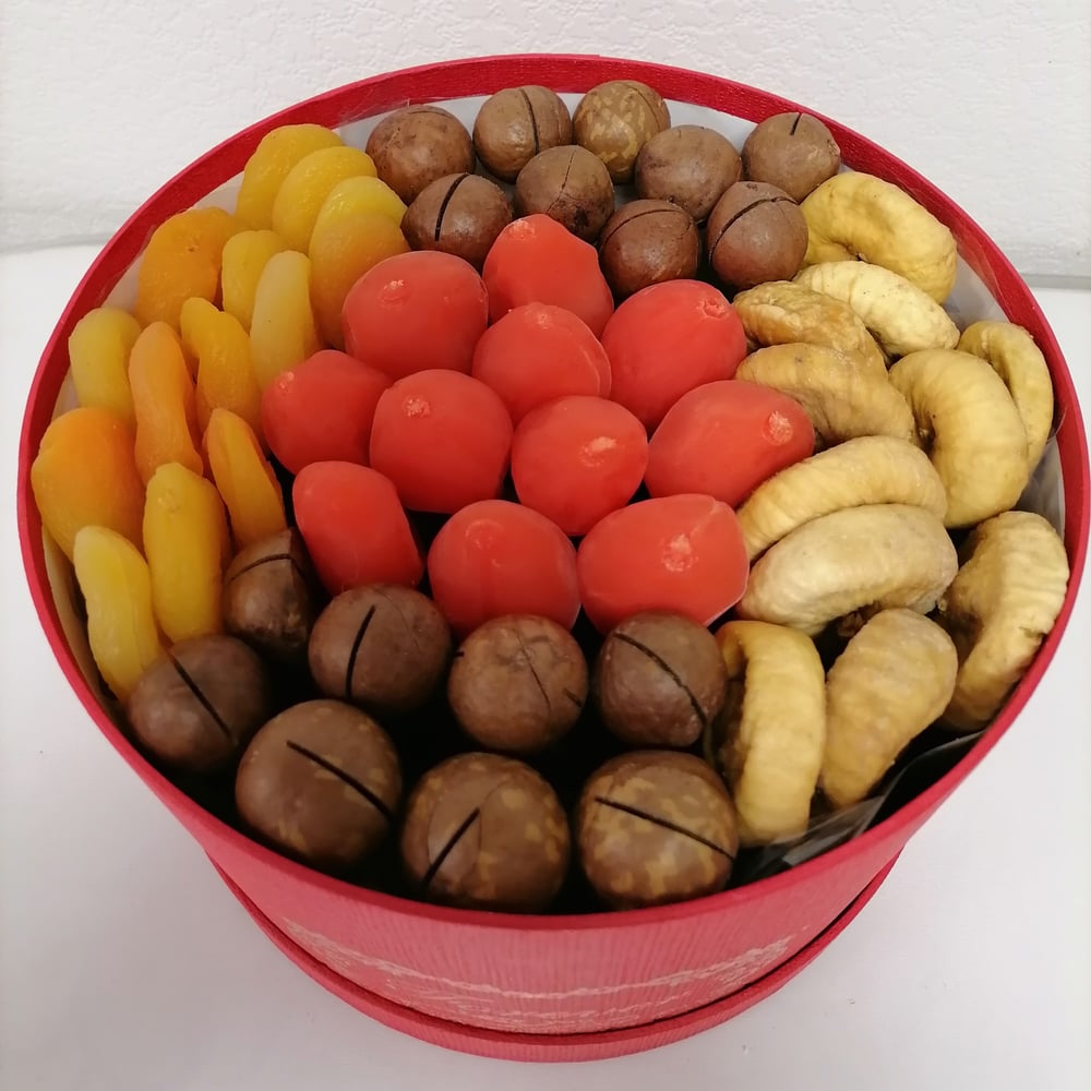 Яркая подарочная шляпная коробка с сухофруктами и орехами. Коробка с сухофруктами и орехам с составом: орех макадамия 200 гр, персик сушёный райский 300 гр, курага 200 гр, инжир 200 гр.