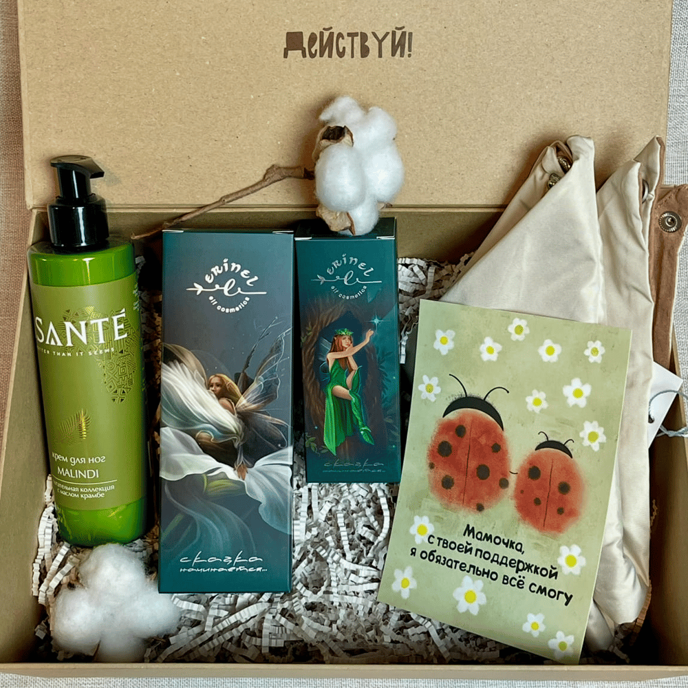 Набор «Уютная забота» создан для того, чтобы окружить маму вниманием и согреть её даже в самые прохладные дни. Мягкая косынка от Unu clothing непромокаемая снаружи, мягкая внутри, не только украшает, но и защищает от непогоды. Органическая косметика Erinel и ASANTE наполняет каждый уход маленькими радостями: бархатная кожа рук, сияющее лицо, ухоженные ножки и аромат, будто из летних снов. ⠀ Упаковано в стильную крафтовую коробку с вдохновляющей надписью — этот подарок тронет сердце и станет напоминанием о вашей любви. Состав: 1. Осенняя косынка уютная и невероятно женственная. Предлагаем выбрать цвет косынки: серый серебристый, молочный, коричневый, черный (укажите в примечании к заказу или мы у Вас уточним после получения заказа!) 2. Элькрем для ручек от органического бренда Erinel (50мл) на основе органических экстрактов. 3. Эльмаска цветов восстанавливающая для лица от Erinel в удобном флаконе с дозатором (50 мл). 4. Питающий крем для ног от российского бренда ASANTE (250мл с дозатором). 5. Дизайнерская открытка 6. Крафтовая коробка из плотного картона на магнитном клапане с вдохновляющей надписью
