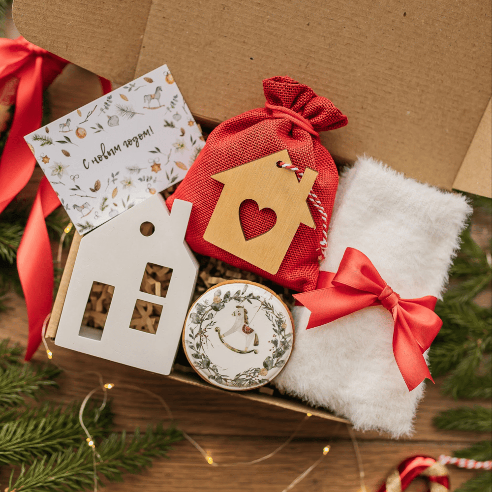 Что внутри? Подсвечник гипсовый "Домик" Носочки женские из шерсти норки, размер 37-41 Чай черный "Таежный сбор" в мешочке, 50 гр. Пряник ручной работы Елочная игрушка деревянная "Домик" Открытка для ваших пожеланий Набор оформлен в крафтовой коробочке 23х16 см с атласной лентой. Подарочный пакет в комплекте!