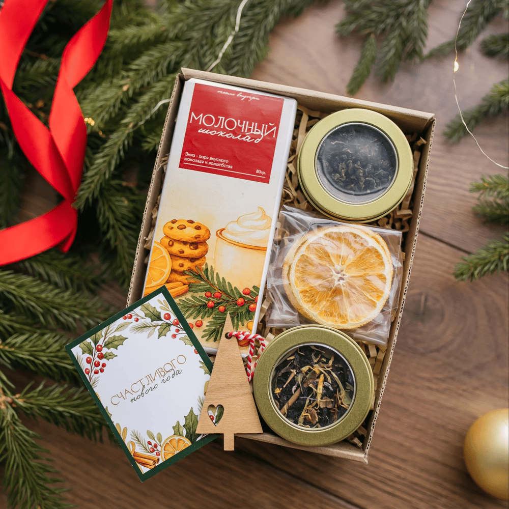 Подарок на Новый год с чаем и шоколадом