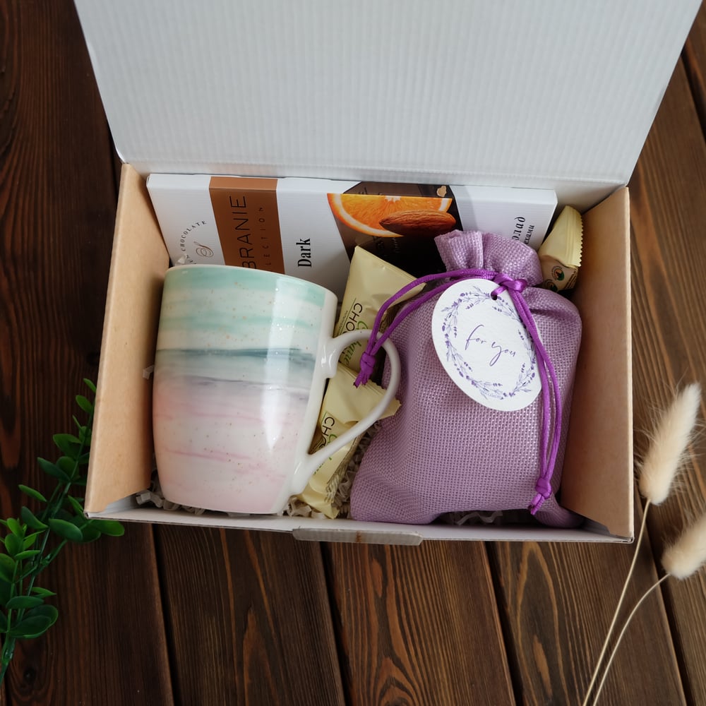 В наборе: 📌Коробка 22*15*10 см 📌Кружка 📌Фруктовый чай в холщовом мешочке 📌Шоколад 📌Мультизлаковые конфеты