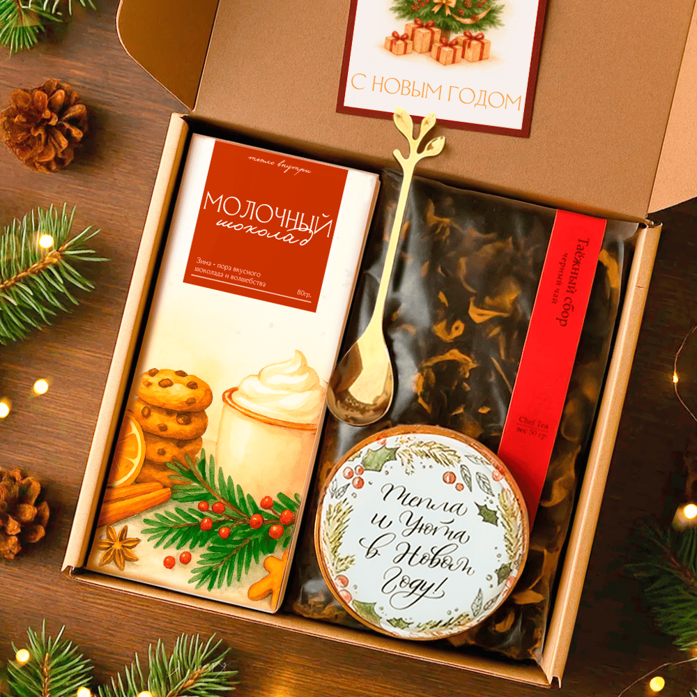 Что внутри? - Чай черный "Таежный сбор" - Шоколад молочный - Пряник ручной работы - Ложка металлическая - Открытка