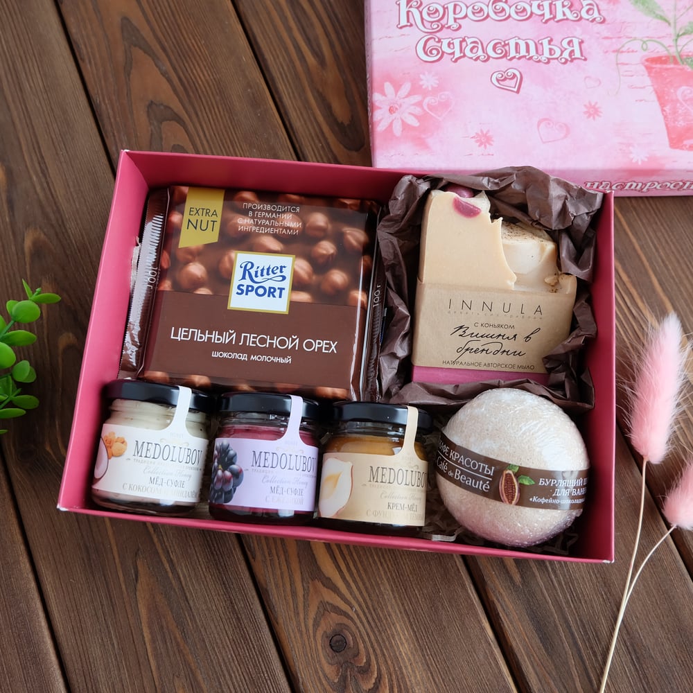 В наборе: 📌Коробка 21*15*6 см 📌Натуральное мыло ручной работы 📌Бурлящий шарик для ванны 📌Крем-мед 3 шт (по 40 гр, вкусы разные) 📌Шоколад Ritter Sport
