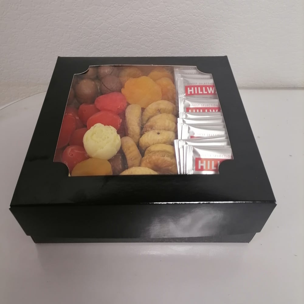 Подарок с сухофруктами, орехами и чаем в оригинальной упаковке. Есть три варианта цветовой гаммы коробки: розовая, серебро, черная. Вы можете указать в комментарии желаемый цвет.
