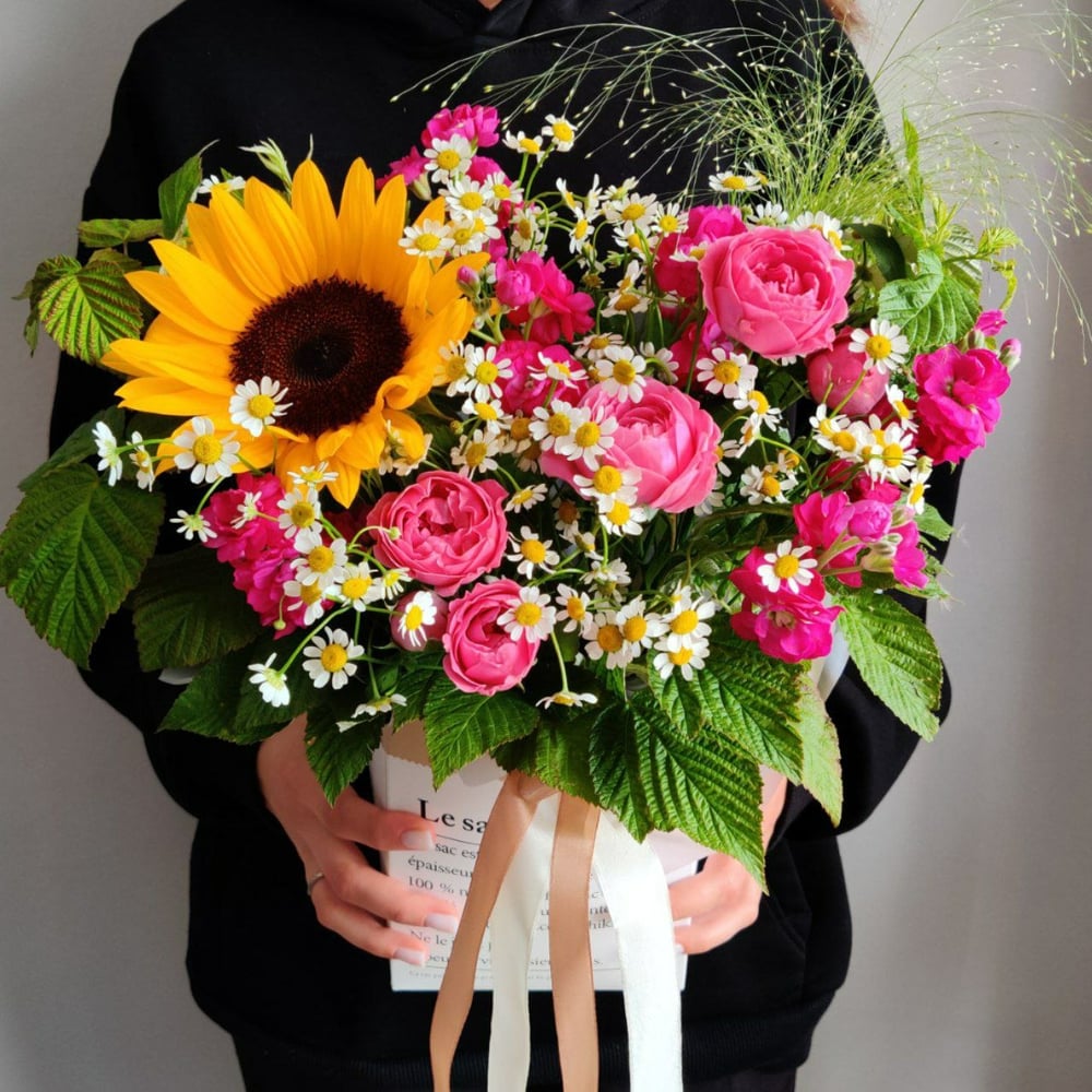 Эта яркая композиция из подсолнуха, кустовой розы, кустовой ромашки, маттиолы, веточек малины и паникума создает неповторимый визуальный эффект, наполненный свежестью и радостью. Центральным элементом является подсолнух с его золотистыми лепестками и темной сердцевиной, который излучает тепло и свет, привлекая внимание. Розы добавляют романтики и элегантности, их насыщенные оттенки гармонично сочетаются с жизнерадостным подсолнухом. Кустовые ромашки вносят нотки простоты и свежести, а маттиола обогащает композицию, придавая ей глубину и утонченность. Веточки малины добавляют яркие зеленые акценты, символизируя летние моменты и создавая ощущение близости к природе. Паникум, с его легкими и воздушными колосками, придает букету дополнительную текстуру и динамичность, создавая эффект легкости. Все эти элементы собраны в стильной коробке, украшенной атласными лентами, что придает композиции завершенный и элегантный вид. Этот букет станет прекрасным подарком для любого повода, наполняя пространство светом и положительными эмоциями. Яркие цвета и разнообразие форм делают его уникальным, создавая атмосферу праздника и радости, которая будет радовать глаз и согревать душу.