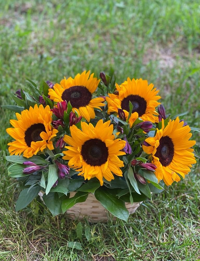 Корзина с цветами «Подсолнухи и альстромерии»