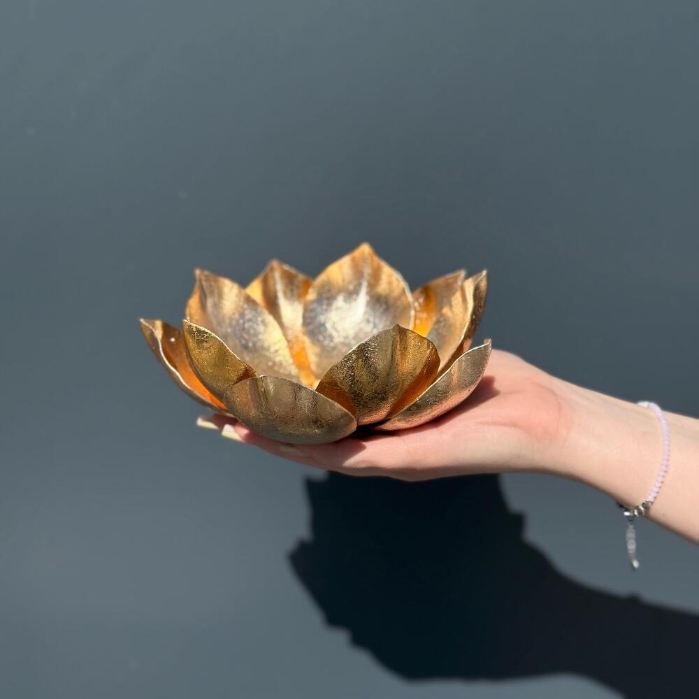 Подсвечник в виде цветка лотоса Изящный подсвечник, выполненный в форме цветка лотоса, станет утончённым акцентом в интерьере. Лотос символизирует чистоту, гармонию и обновление, а мягкий свет свечи, отражаясь в его лепестках, создаёт атмосферу уюта и спокойствия. Такой подсвечник подойдёт как для повседневного использования, так и для особых моментов, наполняя пространство особым теплом и красотой.