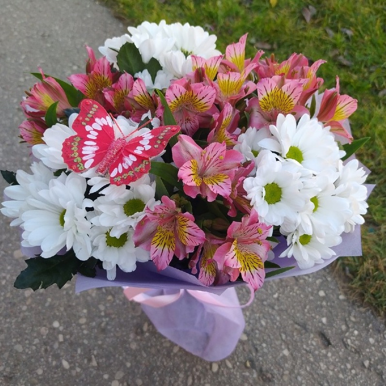 Букет «Полет бабочки» из альстромерий и хризантем