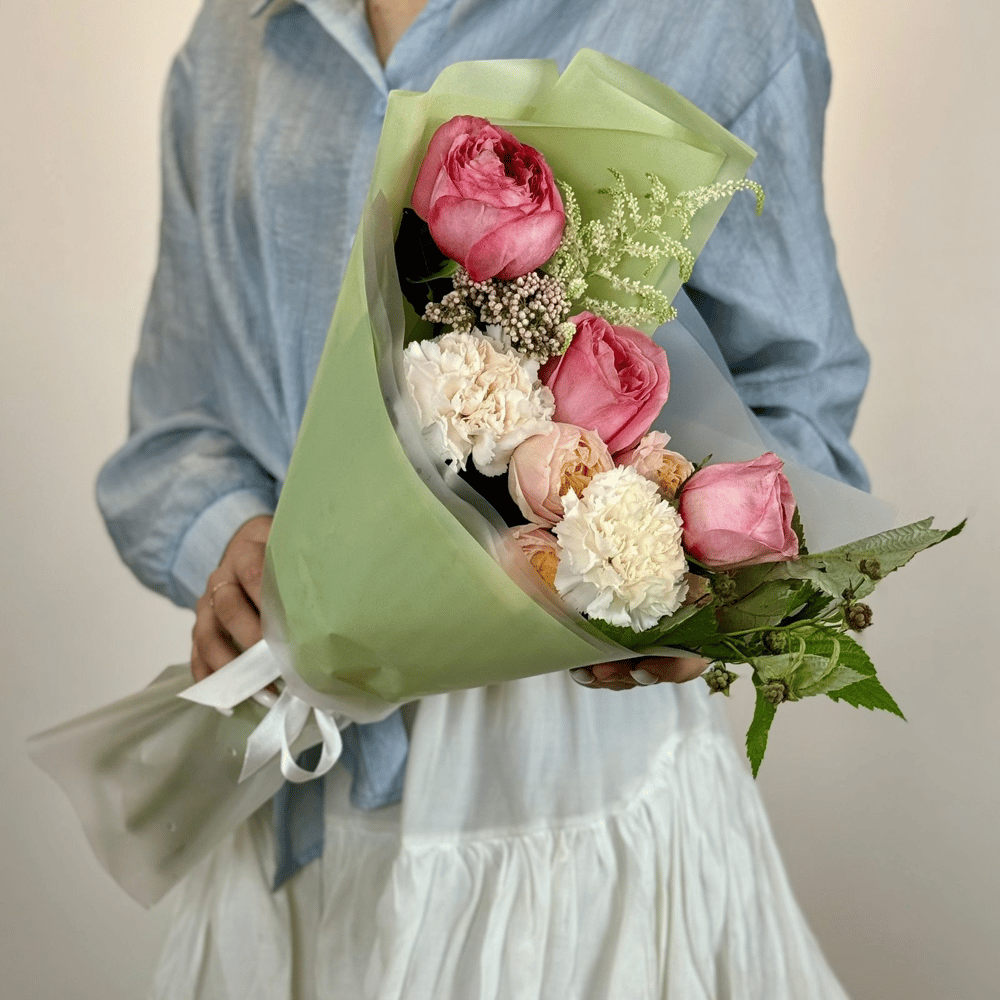 Букет из розы эквадор, кустовой розы, гвоздики и зелени