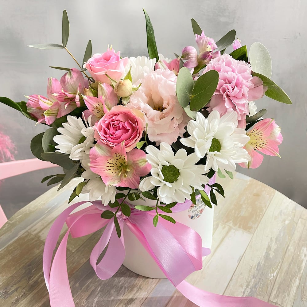 Шляпная коробка с цветами «Полянка» из альстромерий и эустом