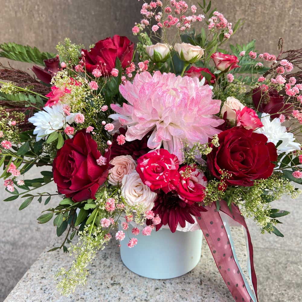 Эта универсальная композиция собрана из цветов, цветовая гамма которых, подходит на разные случаи и торжества👌 Красно бордовые розы, хризантемы и пышная гипсофила внесут очарование в ваш праздник👌