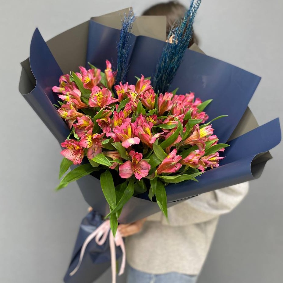 Яркий стильный букет из Альстромерий в сочетании с двумя ветками картодерии приятно удивит вашего близкого человека.