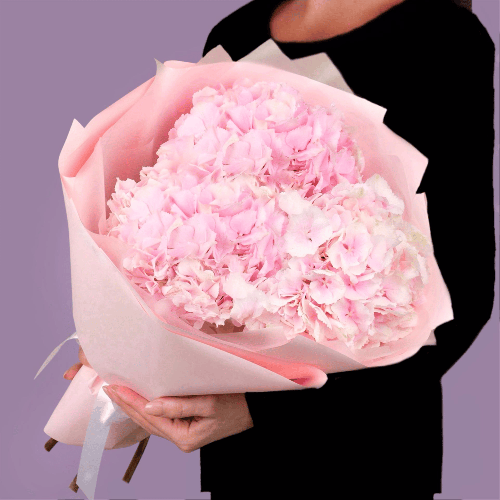 Букет из розовых гортензий в упаковке