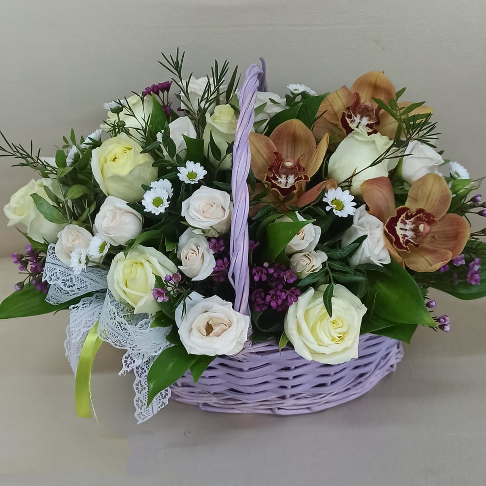 Корзина с цветами «Прекрасное мгновение» из роз и орхидей