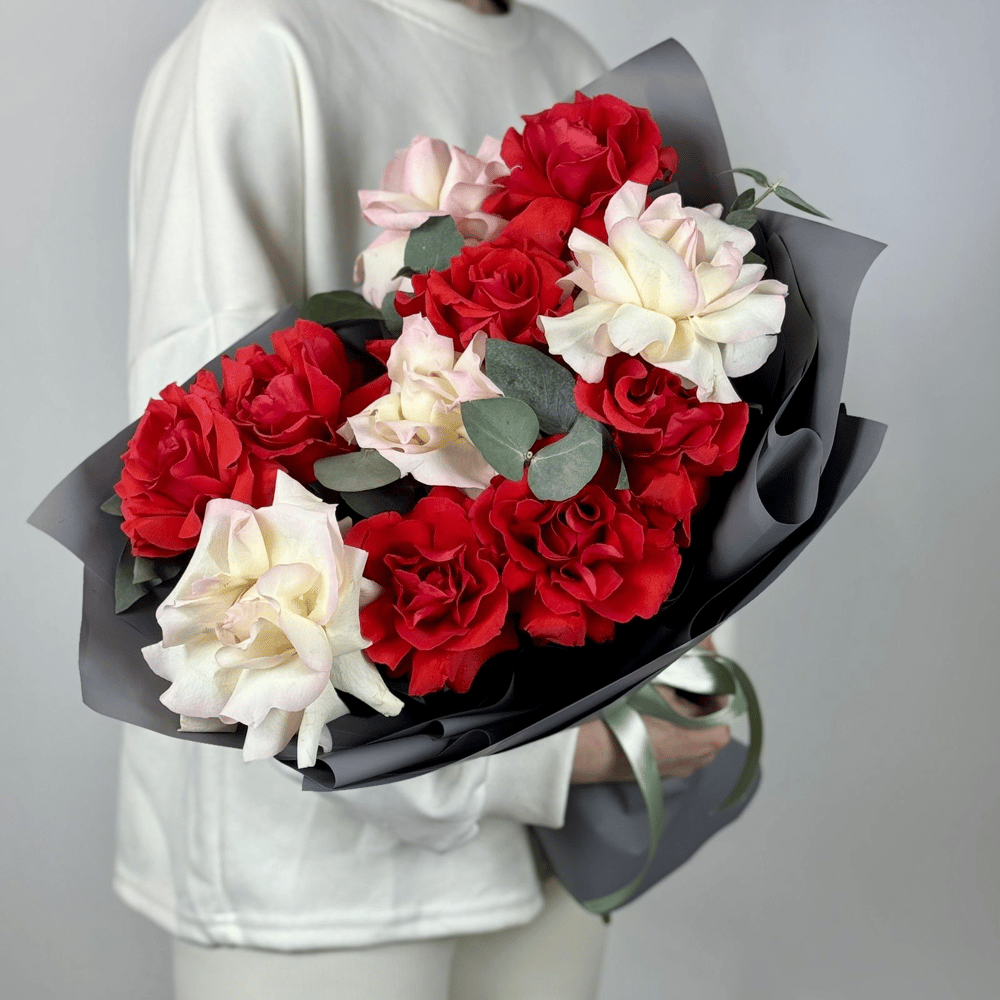 Микс красных и белых роз Эквадор 50 см