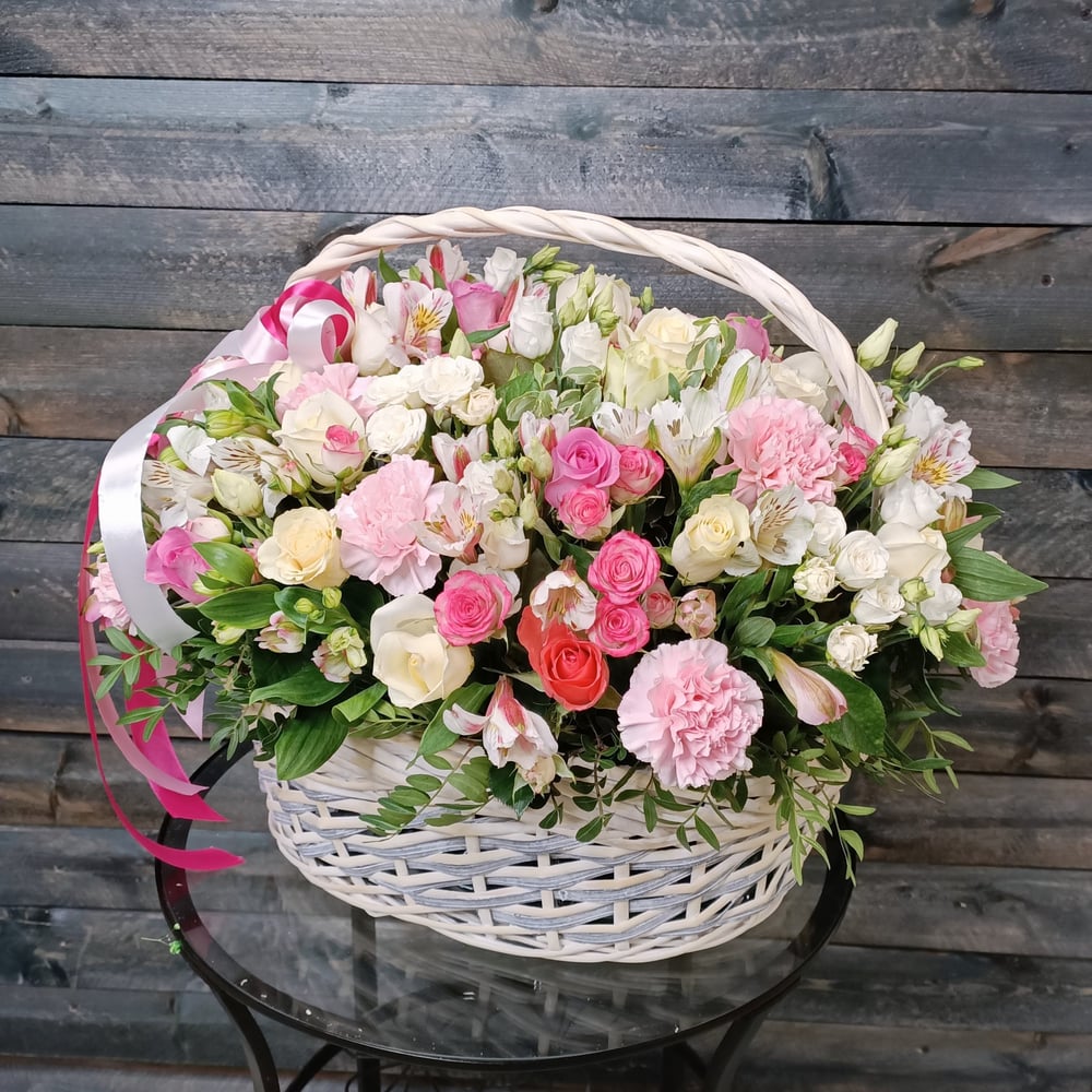 Шикарная большая корзина в нежно-розовой цветовой гамме с розами, альстромериями, пушистыми гвоздиками.