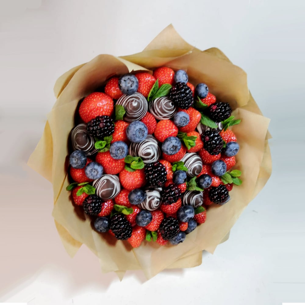 "Прелесть" - очень милая новинка. Букет с нежным и ярким дизайном. В составе букета есть все самое любимое: - Клубника - Клубника в шоколаде - Голубика - Ежевика - Мята Букет возможен в тре...