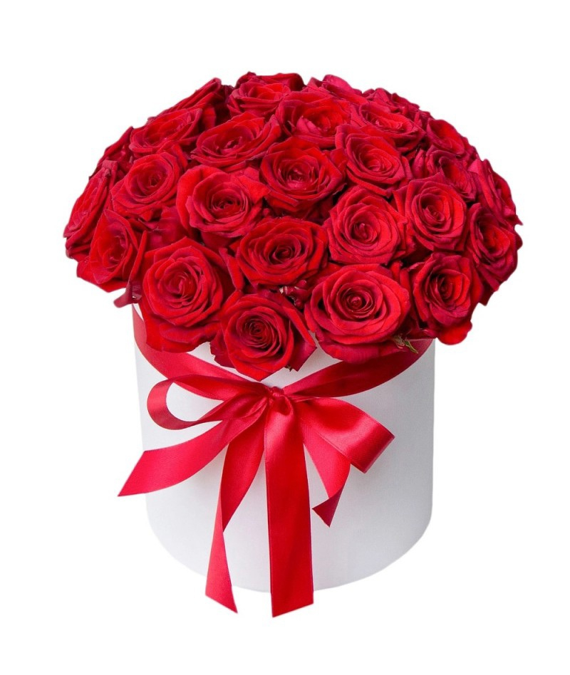 Коробка шляпная ( средняя) 1шт, оазис 1 шт., пленка прозрачная 1 шт., лента атласная 1 шт., Роза 25шт.