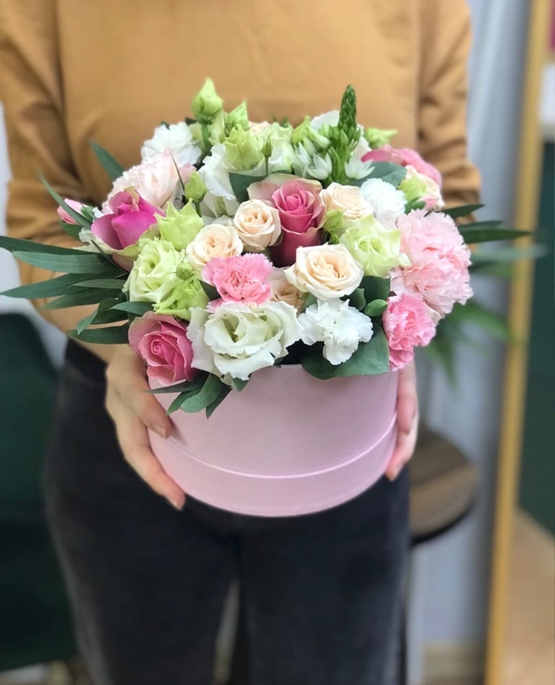 Шляпная коробка с цветами «Притяжение» из роз и гвоздик