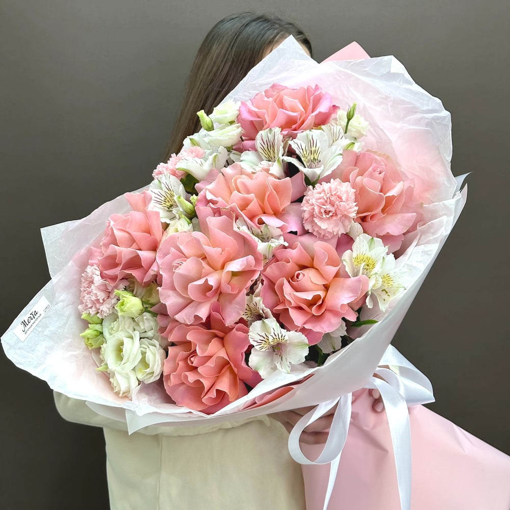Этот нежный и романтичный букет состоит из красивых французских розовых роз, альстромерий, лизиантуса, диантуса, которые создают ощущение легкости и воздушности. Он упакован в элегантную матовую пл...