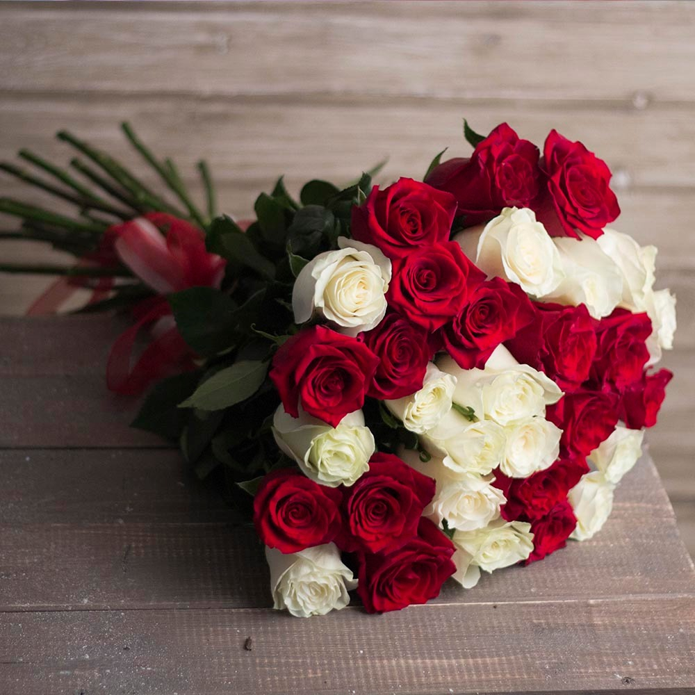 Белые и красные розы собраны по спирали и перевязаны атласными лентами.