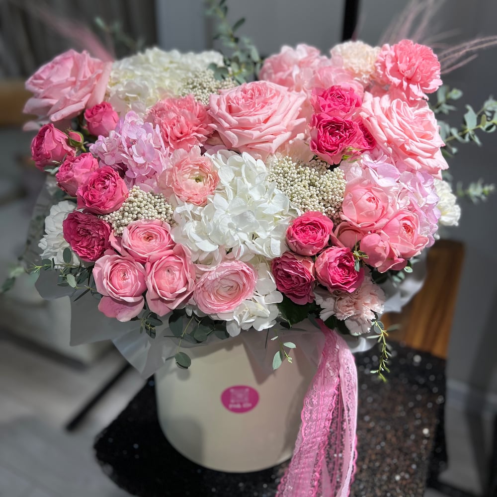 Коробка с цветами «Просто такая сильная любовь» из гортензий и роз