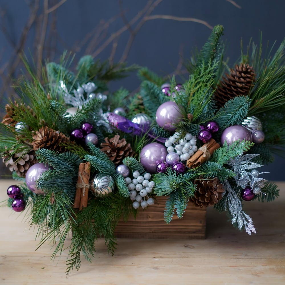 Композиция из голубой ели и новогодних игрушек в сиреневом цвете