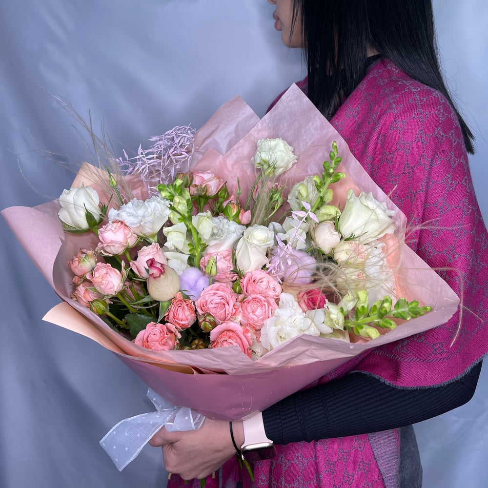 Букет «Пудра» из роз и эустом