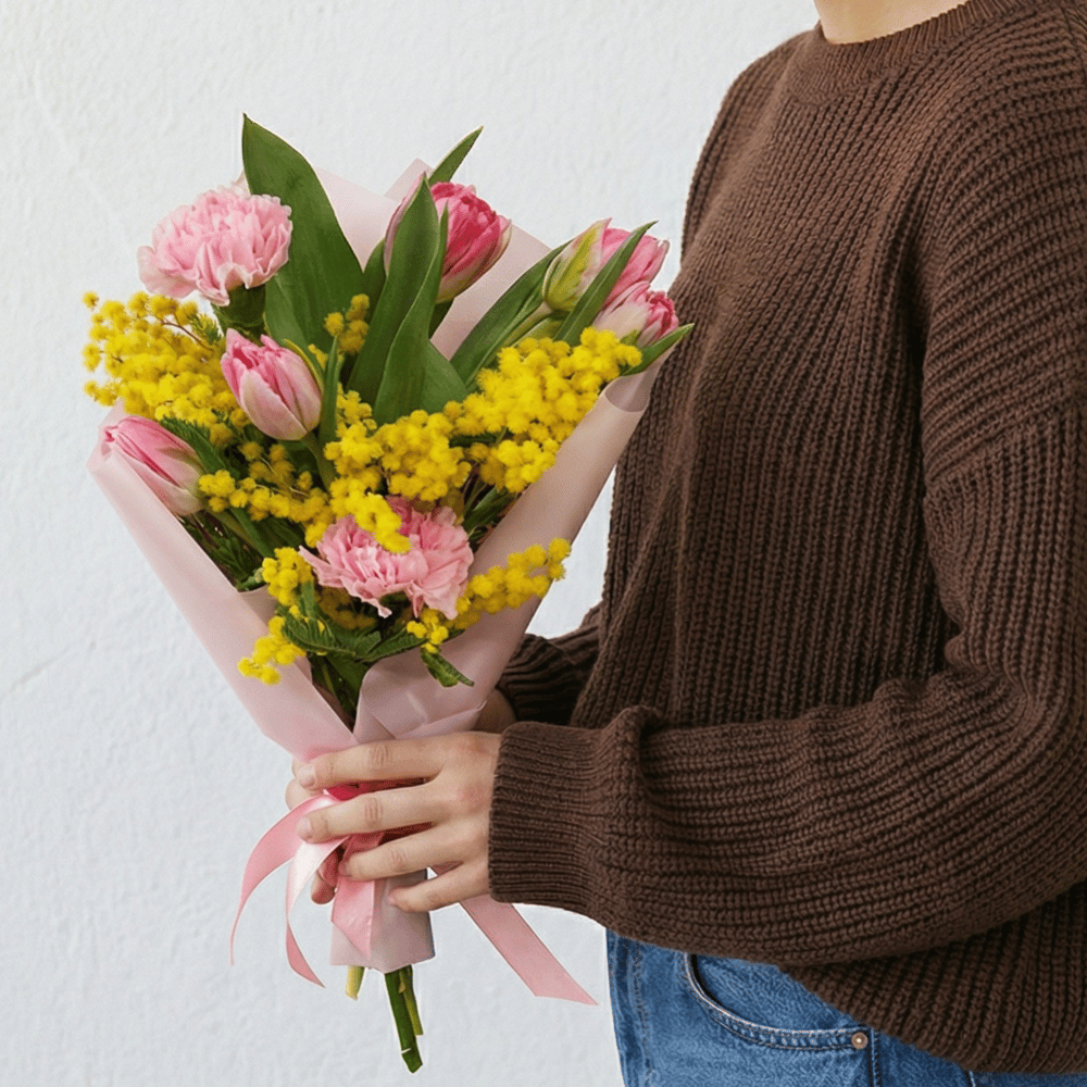 Идеальное сочетание солнечной мимозы и нежно-розовых тюльпанов. Желтые пушистые соцветия дарят легендарный медовый аромат, а розовые тюльпаны добавляют букету утонченности и весенней свежести. Контрастный и жизнерадостный микс, который мгновенно создает праздничное настроение.