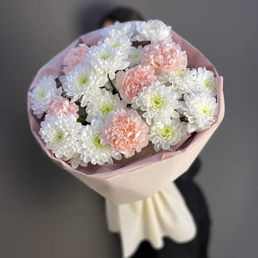 Букет «Пышный кругляш» из гвоздик и хризантем