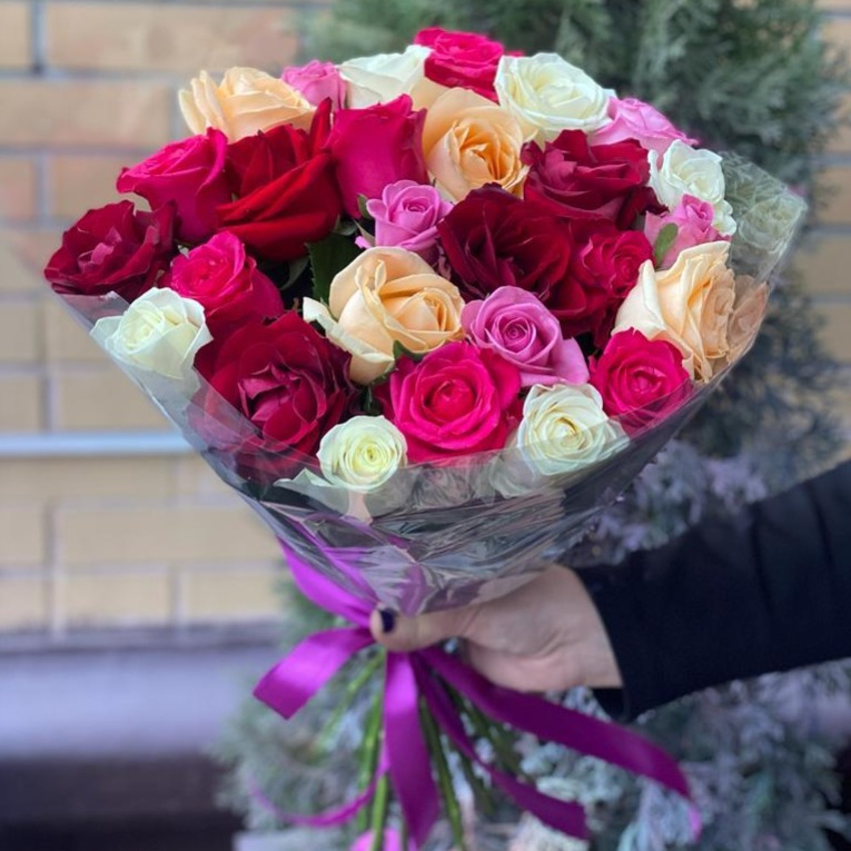 Радостный букет из нежных разноцветных роз, ну что за прелесть ! Чаще радуйте близких и друзей, пусть жизнь играет красками !