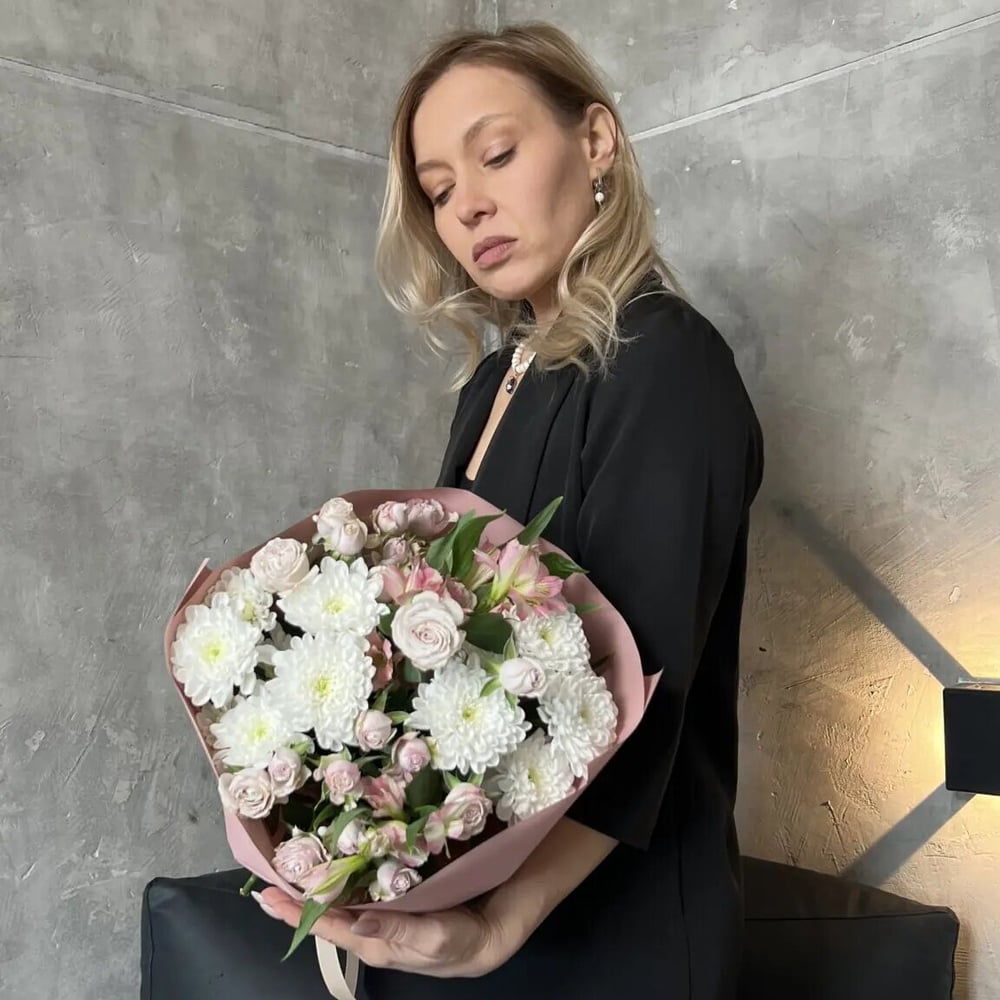 Хризантема мелкоцвет- 2 шт Альстомерия- 2 шт Роза кустовая- 3 шт Зелень- 2 шт Упаковка