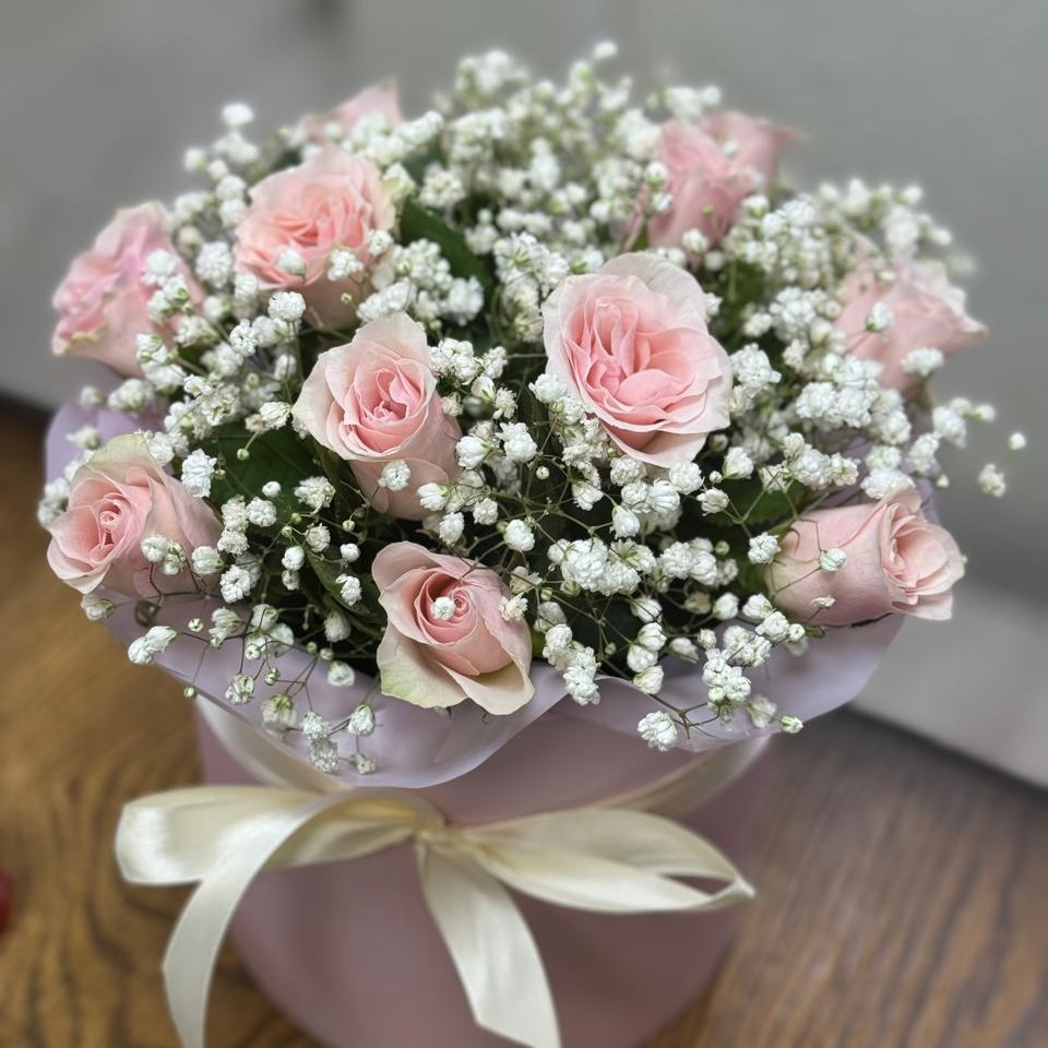 Шляпная коробка с цветами «Радости встречи» из гипсофил